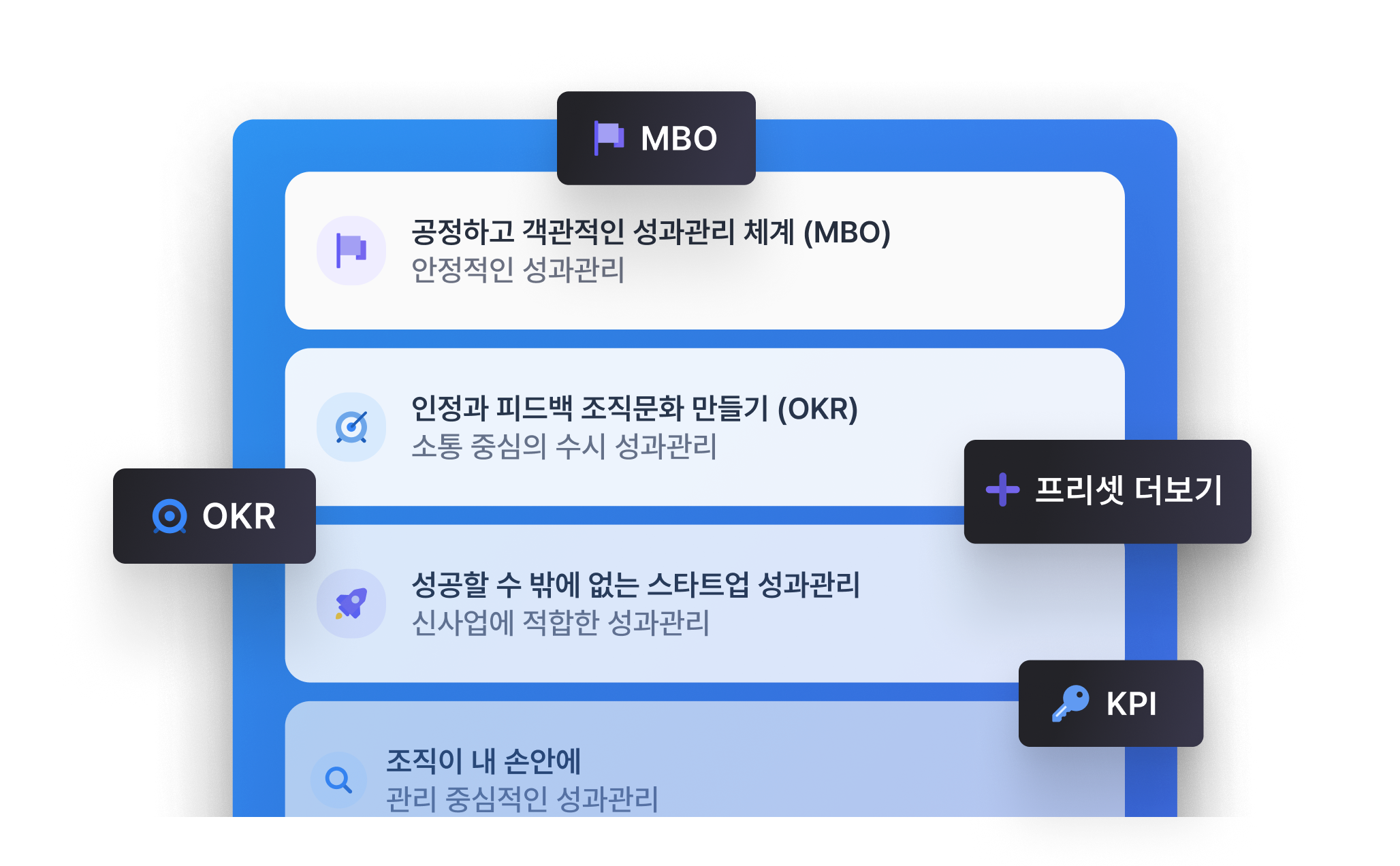 모두 적용 가능한 제도 설계 프리셋OKR, MBO 등 회사 문화에 맞는