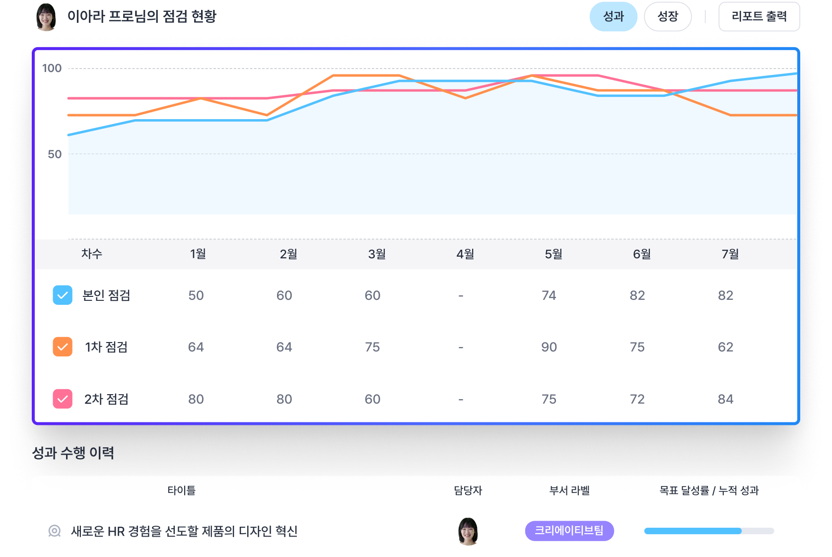 수시/정기 리뷰의 데이터는 인재 정보와 연동되어 과거부터 현재까지의 모든 데이터를 자동으로 기록할 수 있어요. 구성원의 목표 종류, 성과 달성 현황, 주기 별로 점검받은 리뷰 결과를 인재 정보와 함께 확인할 수 있어요.