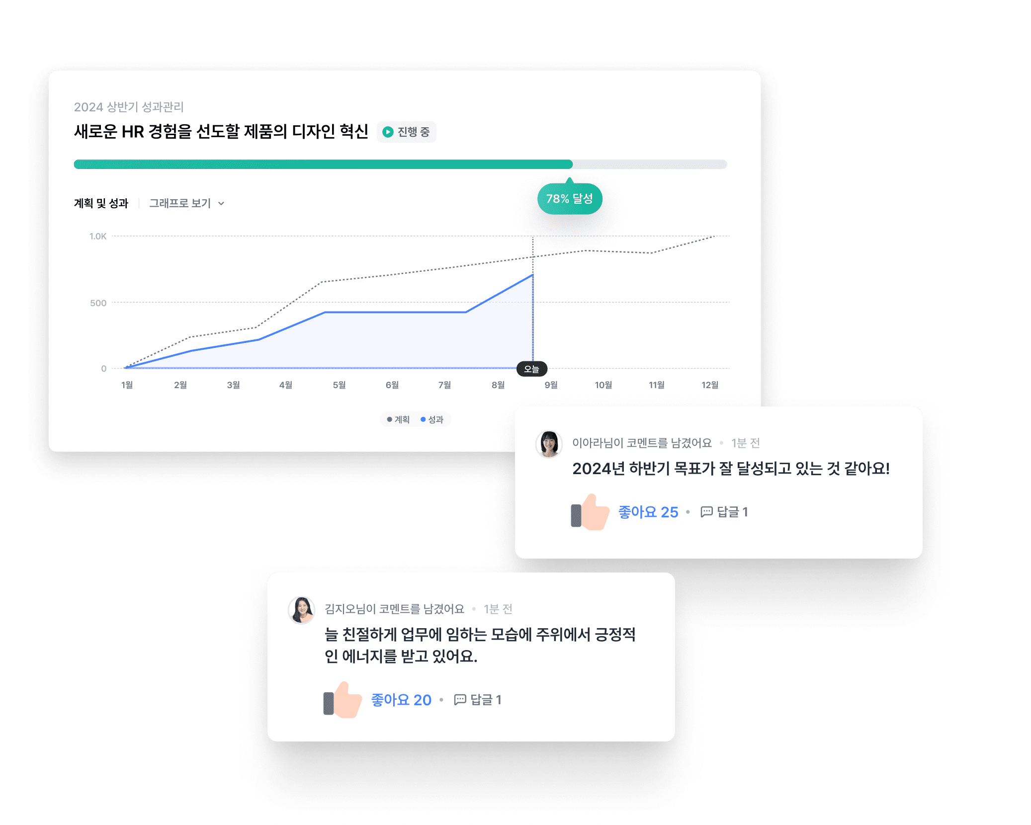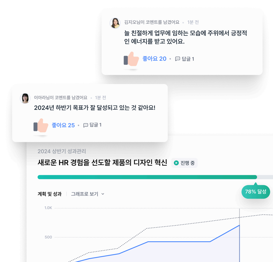 구성원의 핵심 결과에 대한 성과를 주기적으로 리뷰해요. 성과리뷰와 성장리뷰를 통해 구성원의 성장 상태를 확인하고, 개인별 리포트를 통해 코칭과 피드백을 위한 인사이트를 확인할 수 있어요.